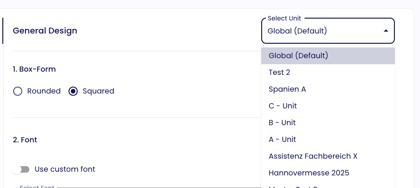 Hinweis: Alle Einstellungen kannst du speziell für Units festlegen, indem du bei "Unit wählen" die Unit auswählst, bei der du das Design ändern willst. So kannst du beispielsweise bei Tochtergesellschaften ein anderes Logo und Design hinterlegen.