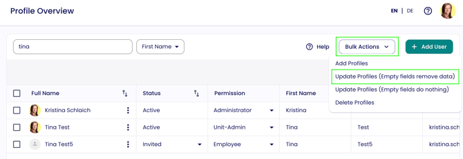 Lade die Datei wieder hoch unter "Nutzerprofile" -> "Bulk-Aktionen" -> "Profile aktualisieren (leere Felder löschen Daten)"