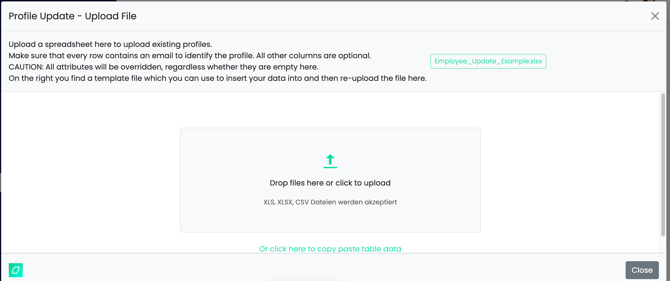 - Öffne den Excel-Importer unter "Nutzerprofile" -> "Bulk-Aktionen" -> "Profile aktualisieren (leere Felder werden ignoriert)"