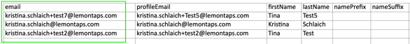 Wichtig: In der Excel-Tabelle muss die E-Mail-Adresse jedes Nutzers enthalten sein, da sie als eindeutiger Identifizierer verwendet wird, um die Daten korrekt den Profilen in Lemontaps zuzuordnen.