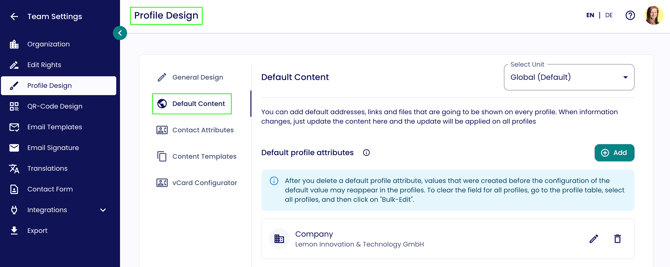 Team-Einstellungen → Profil-Design → Standardinhalt