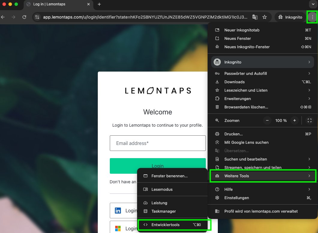 Klicke auf die Schaltfläche ⋮ > Gehe zu „Weitere Tools“ > „Entwicklungstools“.