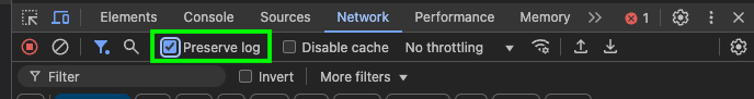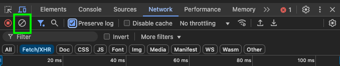 - Klicke auf die Schaltfläche mit dem diagonal durchgestrichenen grauen Kreis, um eventuell vorhandene Protokolle in der Registerkarte „Netzwerk“ zu löschen.
