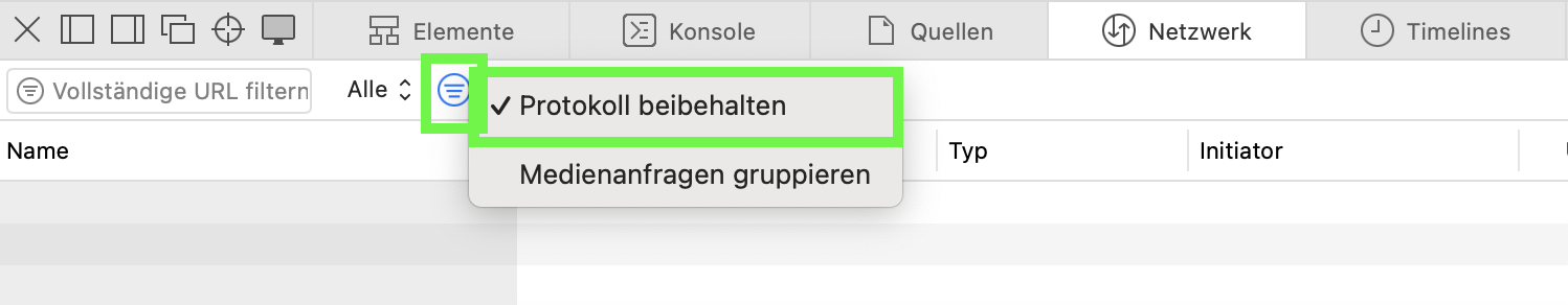 - Klicke auf den Papierkorb, um eventuell vorhandene Protokolle in der Registerkarte „Netzwerk“ zu löschen.