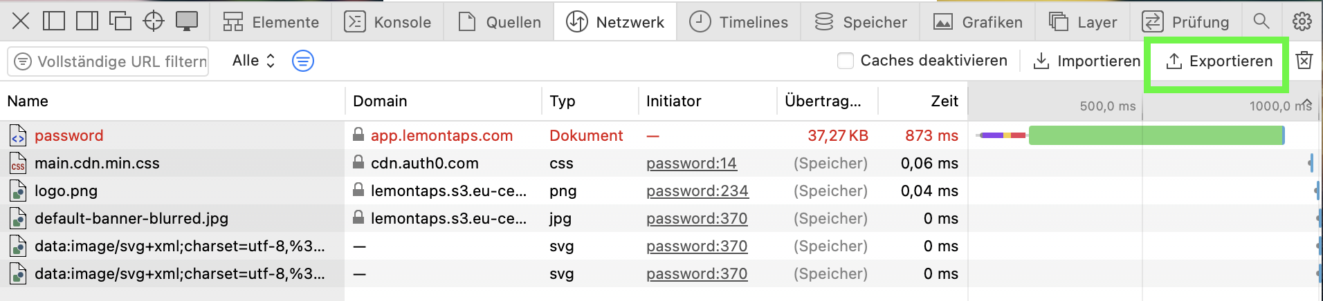 Es kann vorkommen, dass unser Support-Team zusätzliche Informationen zu den Netzwerkanfragen benötigt, die von deinem Browser generiert werden. In diesem Fall bitten wir dich möglicherweise, die Netzwerkanfragen, die während des Problems aufgezeichnet wurden, zu exportieren und uns als HAR-Datei zu übermitteln.