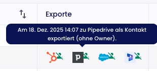 - Status des Exports: In der Kontakttabelle sieht man in der "Export" Spalte den Status. Wenn man auf das Symbol klickt, sieht man weitere Informationen, bspw. wann der Export stattgefunden hat. Falls hinter dem Pipedrive Symbol ein Ausrufezeichen steht, sieht man dass der Export fehlgeschlagen ist. Falls man manuell die Kontakte pusht, bekommt man außerdem immer eine Email bei wie vielen Kontakten der Export funktioniert/fehlgeschlagen hat.