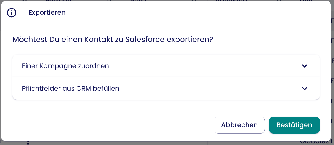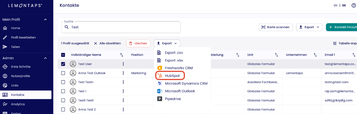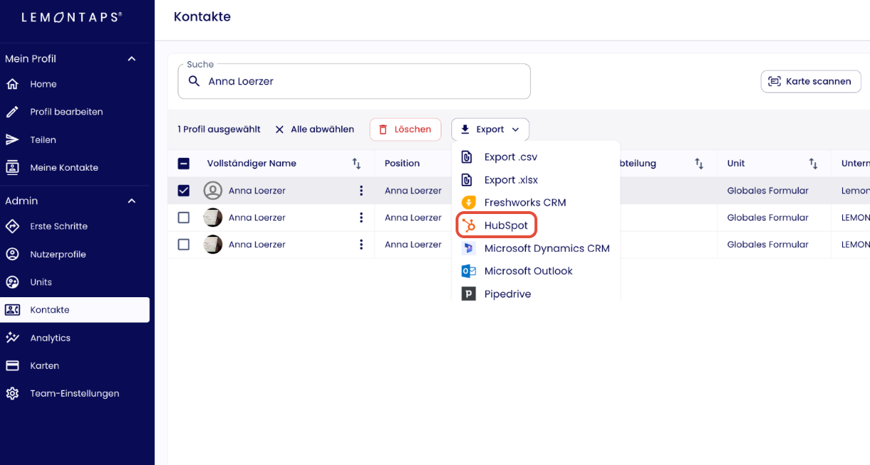 Beim Export eines Kontakts, z. B. nach Hubspot, erscheint nun eine Auswahloption.