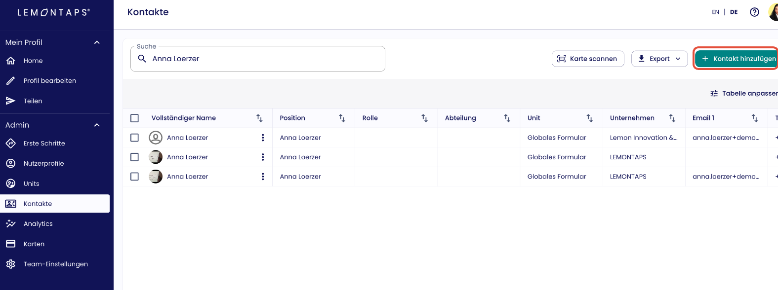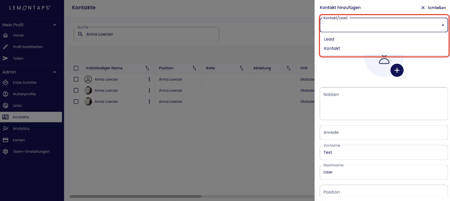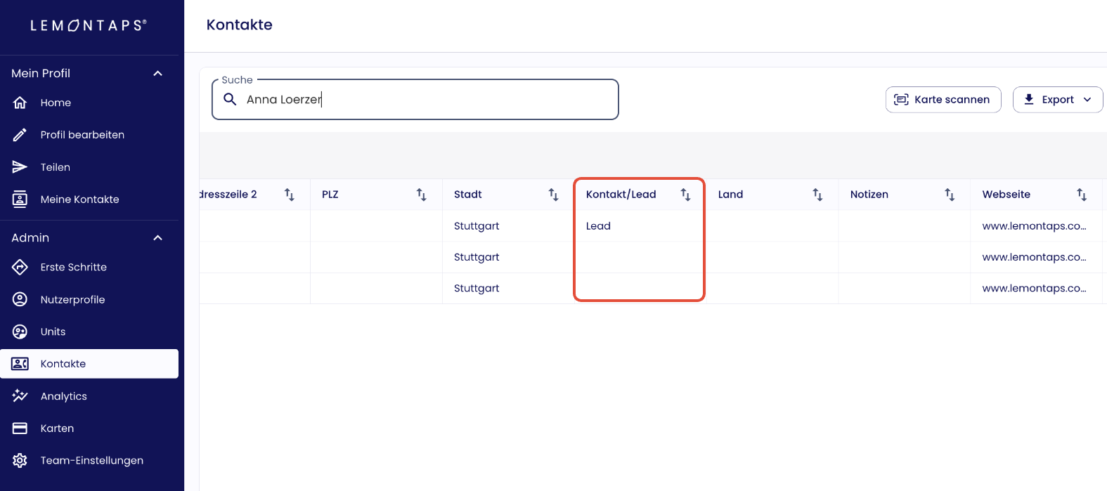 - Bei Leads muss mindestens der Firmennamen und 1 Name im Lemontaps Kontakt angegeben sein, ansonsten funktioniert der Export nicht
