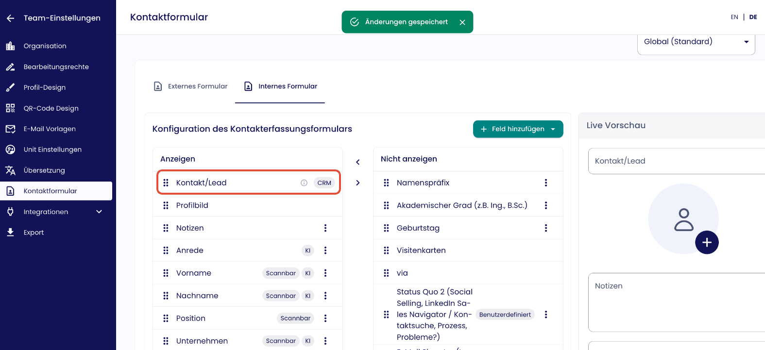 Wählst du die 3.Option "Ermögliche Benutzer:innen die Auswahl zwischen "Kontakt" und "Lead" aus, dann navigiere zum Internen Formular und schiebe das Feld "Kontakt/Lead" auf „Anzeigen“.