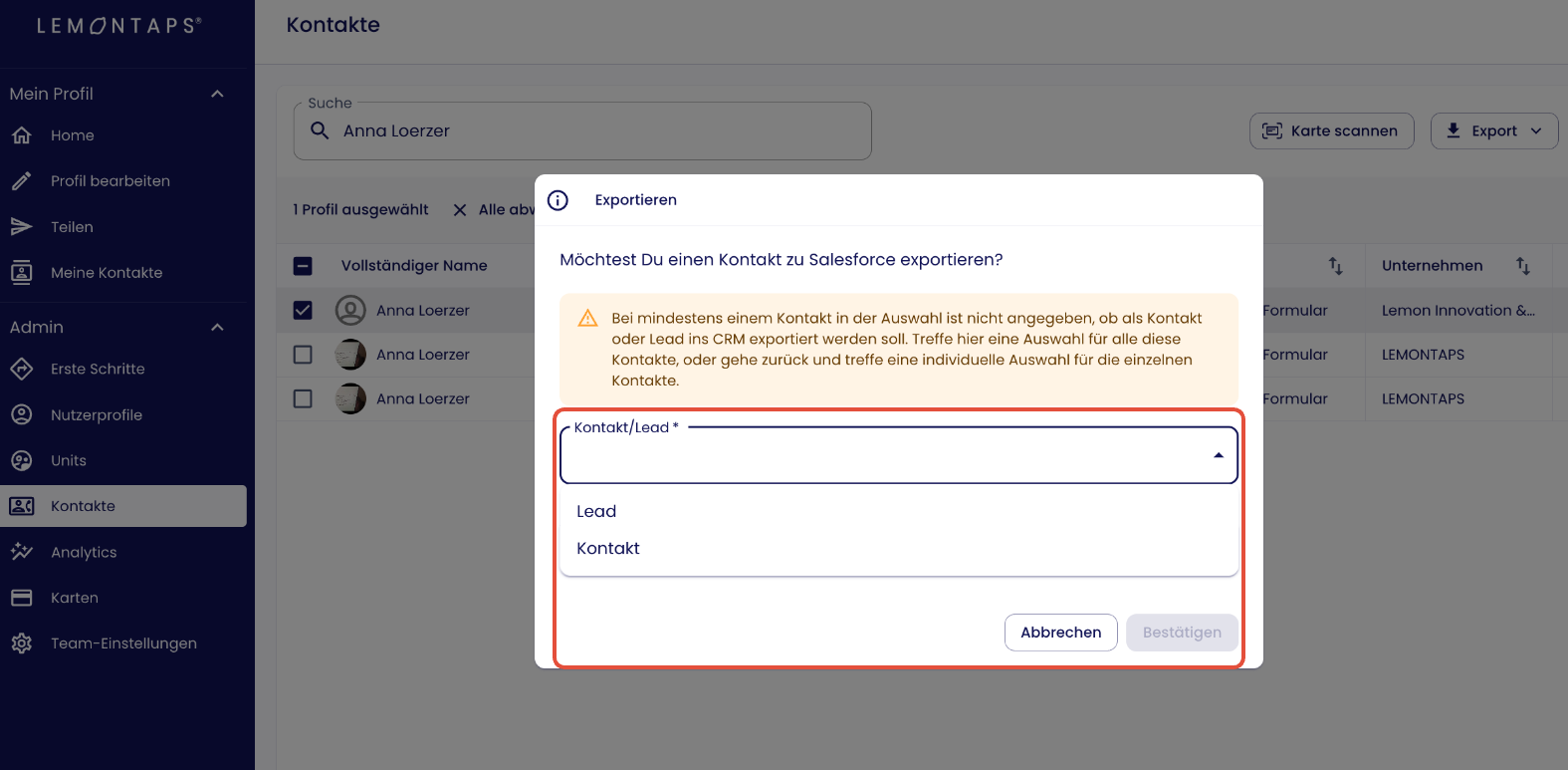 Falls die Auswahl bereits beim Erstellen des Kontakts in Lemontaps getroffen wurde, entfällt die erneute Abfrage beim Export.
