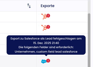 - Status des Exports: In der Kontakttabelle sieht man in der "Export" Spalte den Status. Wenn man auf das Symbol klickt, sieht man weitere Informationen, bspw. wann der Export stattgefunden hat. Falls hinter dem Salesforce Symbol ein Ausrufezeichen steht, sieht man dass der Export fehlgeschlagen ist. Falls man manuell die Kontakte pusht, bekommt man außerdem immer eine Email bei wie vielen Kontakten der Export funktioniert/fehlgeschlagen hat.