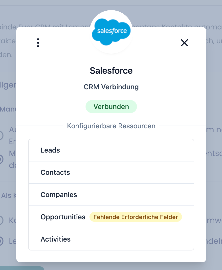 Wenn du in Salesforce Pflichtfelder definiert hast, werden dir diese automatisch im Popup für die Einrichtung angezeigt.