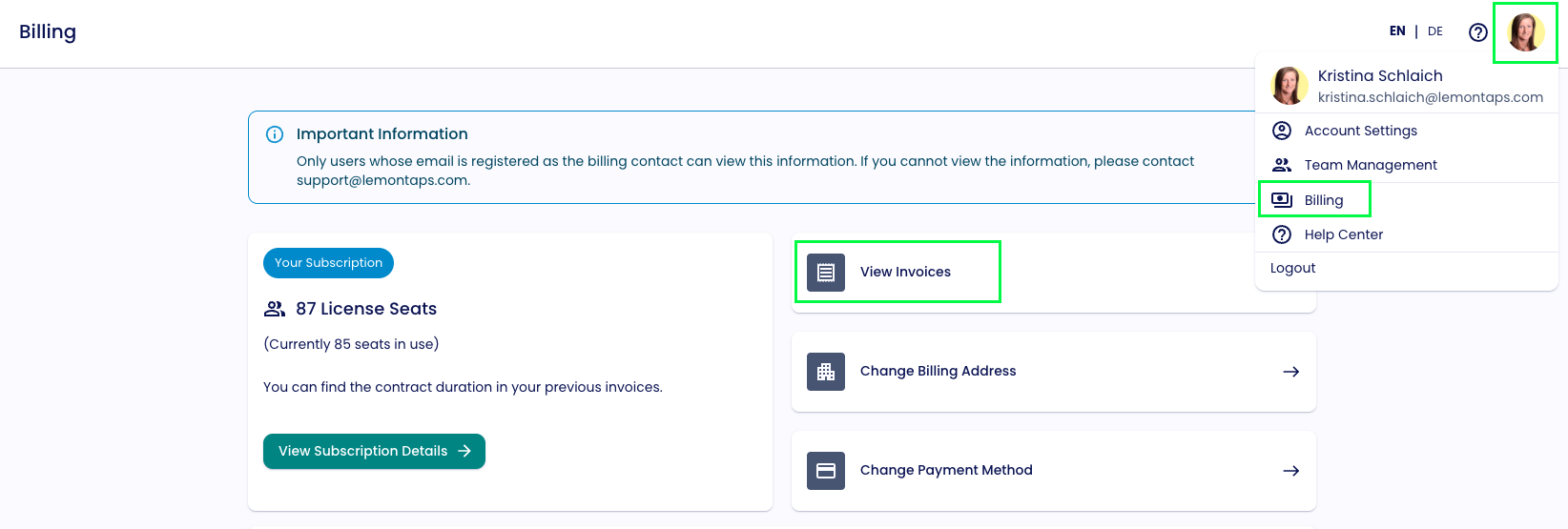 Hinweis: Der Haupt-Rechnungskontakt kann sich vom Main Account der Plattform unterscheiden.