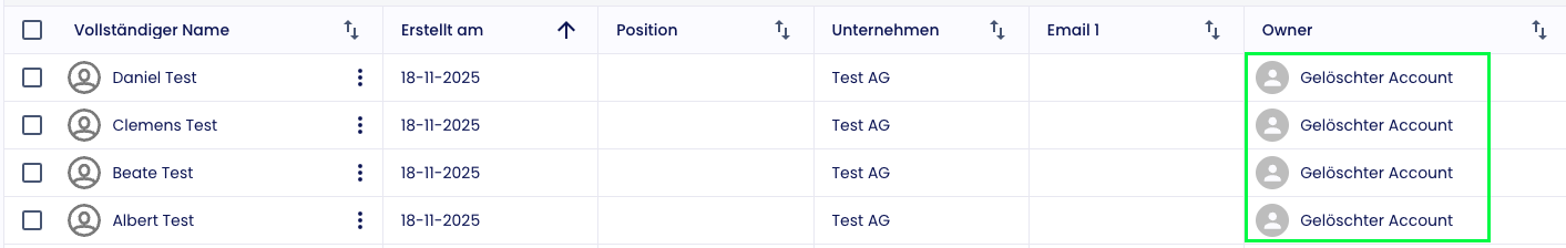 Diese gespeicherten Kontakte findest du weiterhin im Bereich Kontakte, gekennzeichnet mit dem Owner „Gelöschter Account“.
