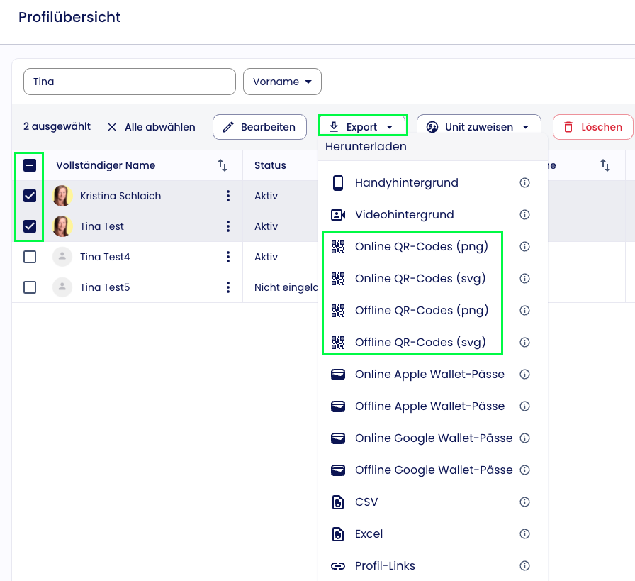 Du erhältst dann eine zip File mit allen QR-Codes der ausgewählten Nutzerprofile.