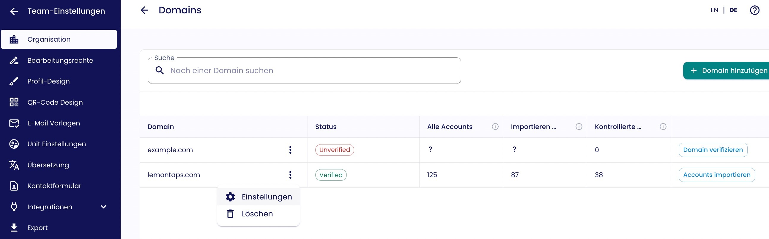 - Öffne über das Drei-Punkte-Menü der verifizierten Domain die Einstellungen.