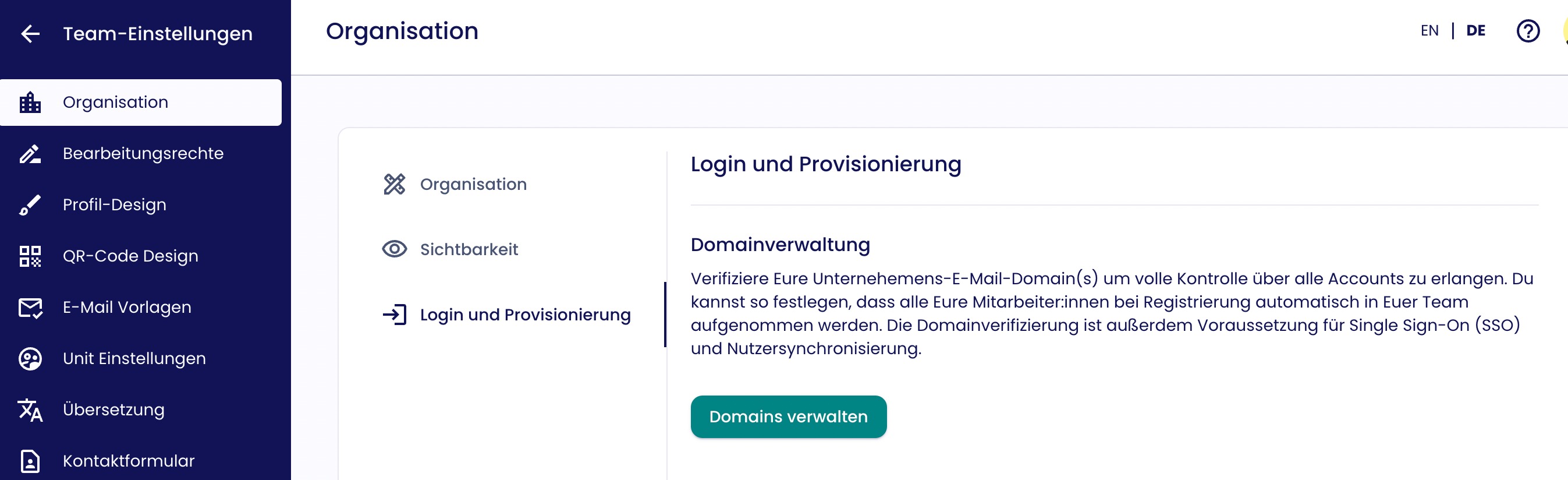 1. Gehe zu Organisation > Login und Provisionierung und öffne unter Domainverwaltung die Option Domain verwalten.