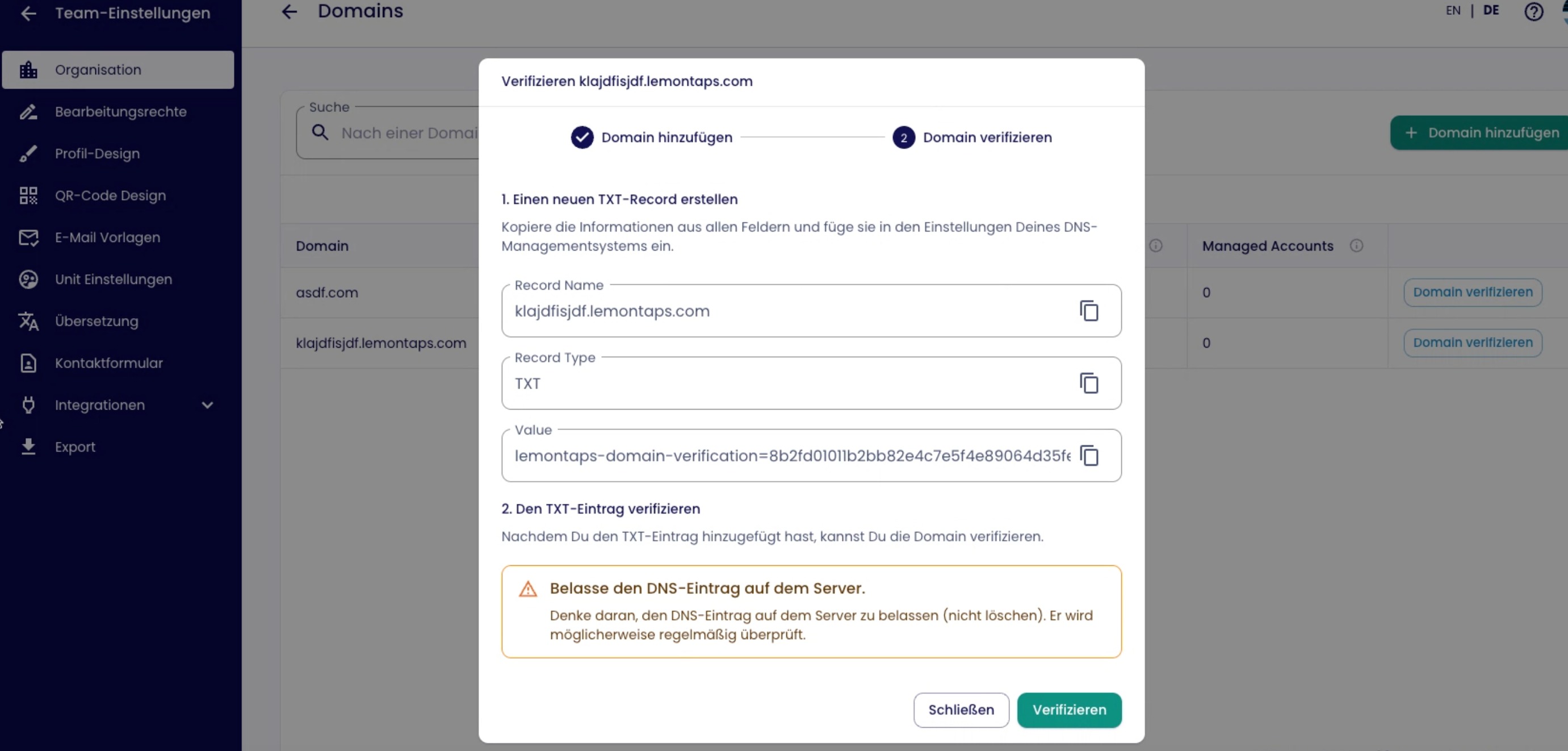 4. Kopiere die angezeigten DNS-Daten und füge sie in das DNS-Managementsystem eures Providers ein.
