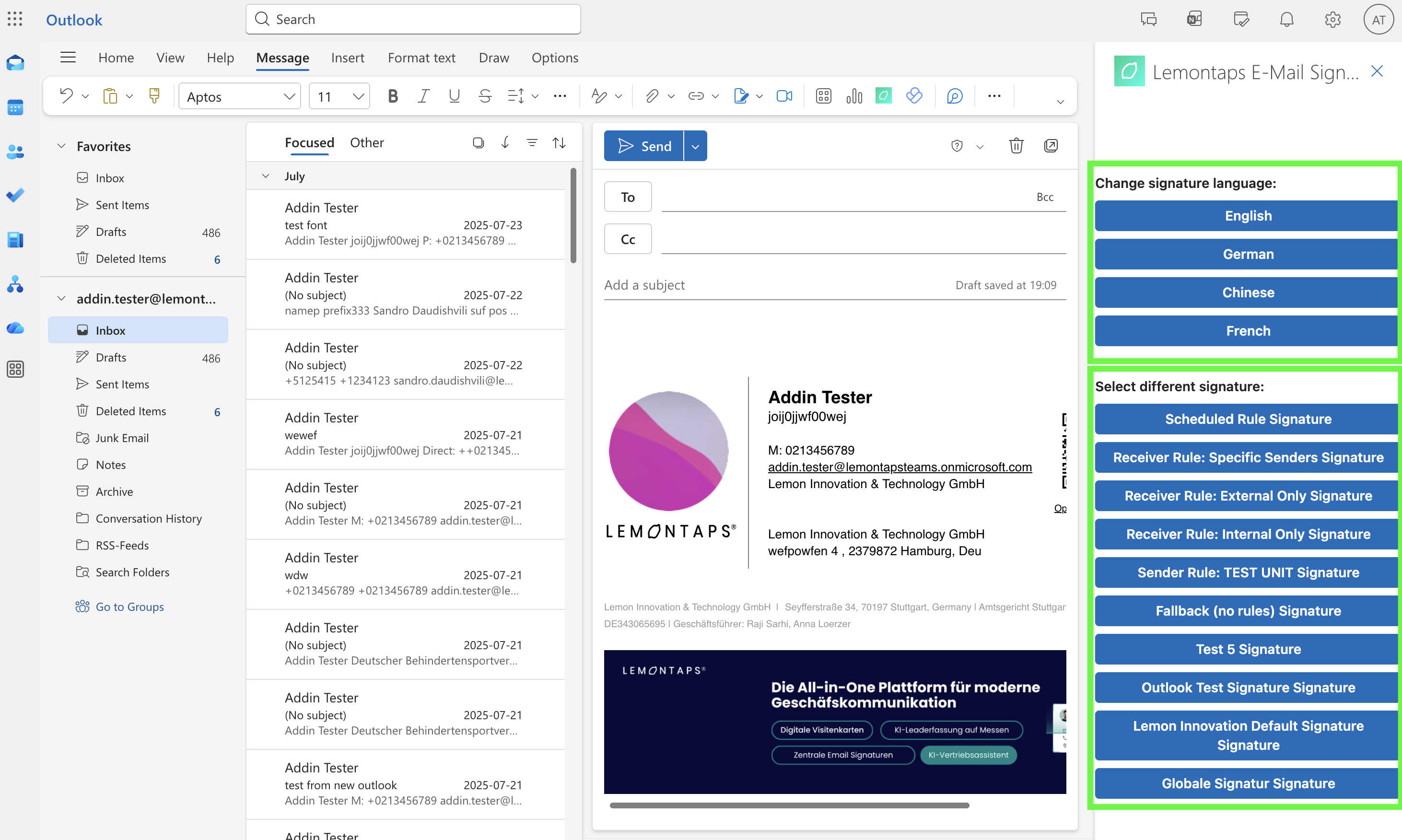 After that, the signatures are automatically available to all users selected in Outlook with a Lemontaps account - provided that the email address stored is identical. The signatures always remain up-to-date: Changes in Lemontaps, such as updated contact information or new email designs, are automatically adopted.