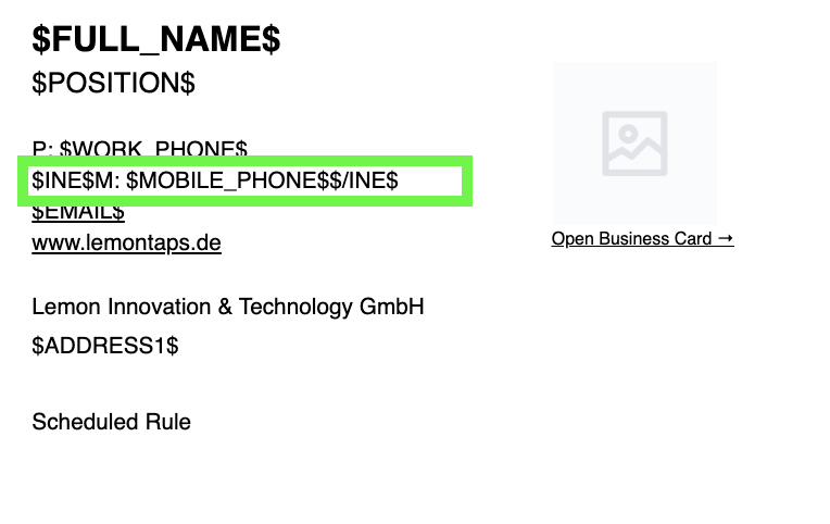 With the Lemontaps signature editor, you can create customized signatures for different user groups or languages via drag & drop. Placeholders ensure that the signatures are automatically filled with the information from the users' digital business cards. In order for signatures to be available in Microsoft Outlook, a Microsoft administrator must install the Lemontaps add-in.
