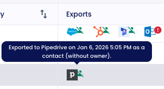- Status of the export: In the contact table, you can see the status in the “Export” column. If you click on the symbol, you can see further information, e.g. when the export took place. If there is an exclamation mark behind the Pipedrive symbol, you can see that the export has failed. If you manually push the contacts, you will also always receive an email with the number of contacts for which the export worked/failed.