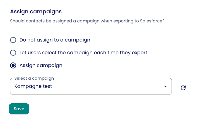- Select one specific campaign that will be applied to all exports to Salesforce.