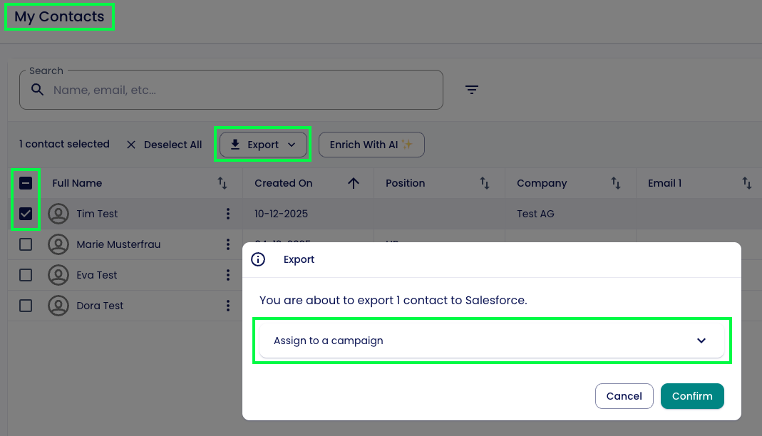 If you select the option to choose a campaign individually for each export, you can do this later under “My Contacts” (and for admins, also under “Contacts”).