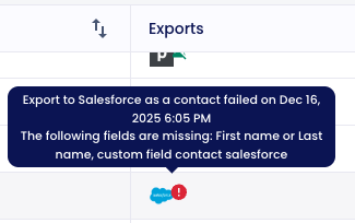 - Status of the export: In the contact table, you can see the status in the “Export” column. If you click on the symbol, you can see further information, e.g. when the export took place. If there is an exclamation mark behind the Salesforce symbol, you can see that the export has failed. If you manually push the contacts, you will also always receive an email with the number of contacts for which the export worked/failed.