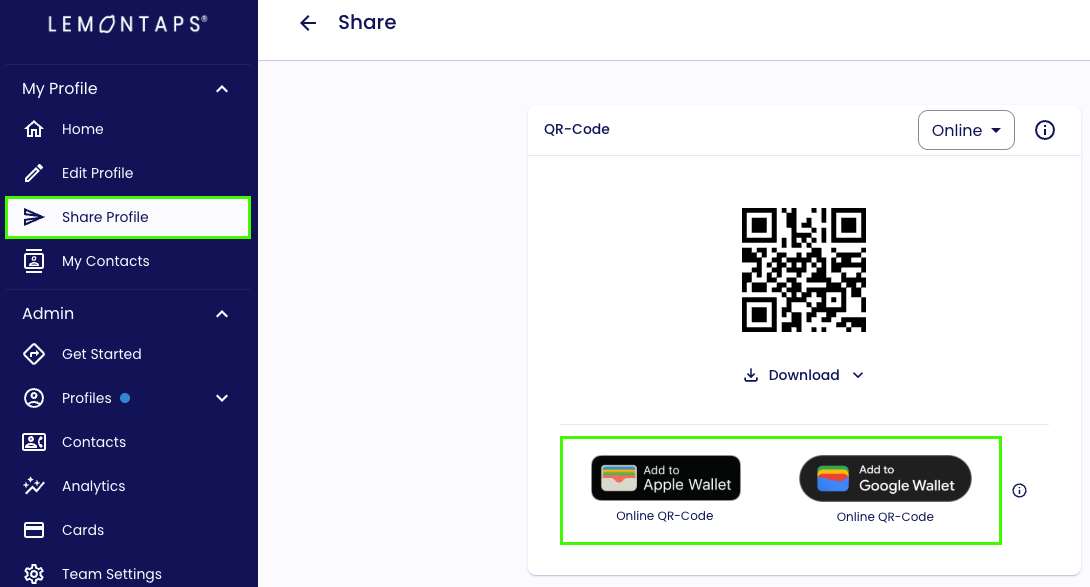 You can set up your Wallet QR code directly under Share Profile in your Lemontaps profile.