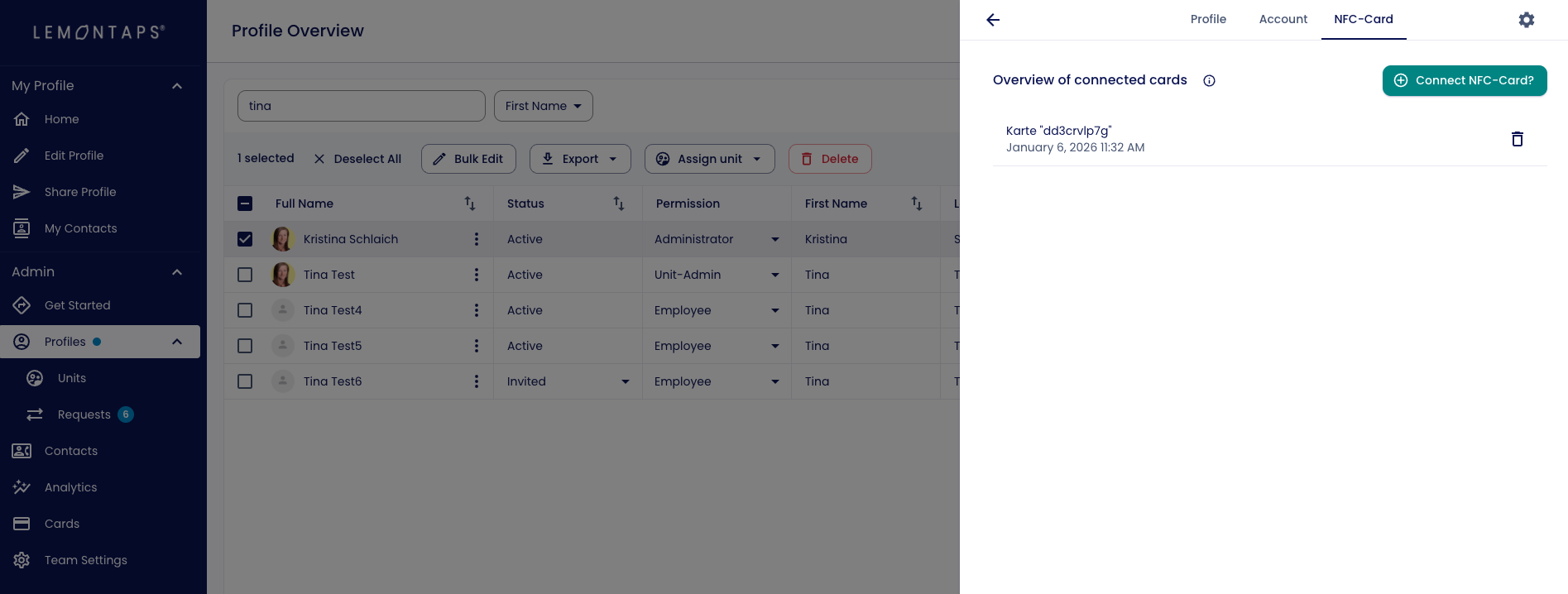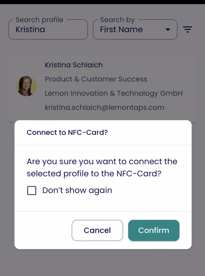 In this article, you’ll learn how to correctly link a Lemontaps NFC business card to a user profile as an administrator - either via smartphone or via the Management Platform.